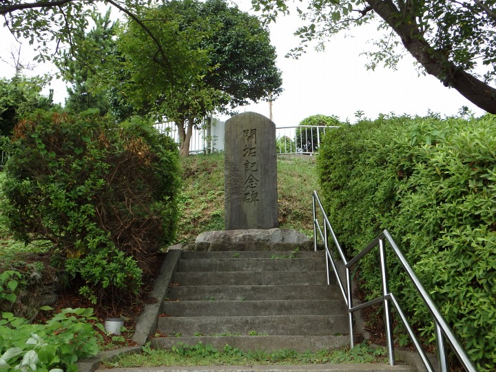 [ 10/46 ] 「開拓記念碑」。裏側に「十三峠開拓農業協同組合」21人の名前が刻まれている。